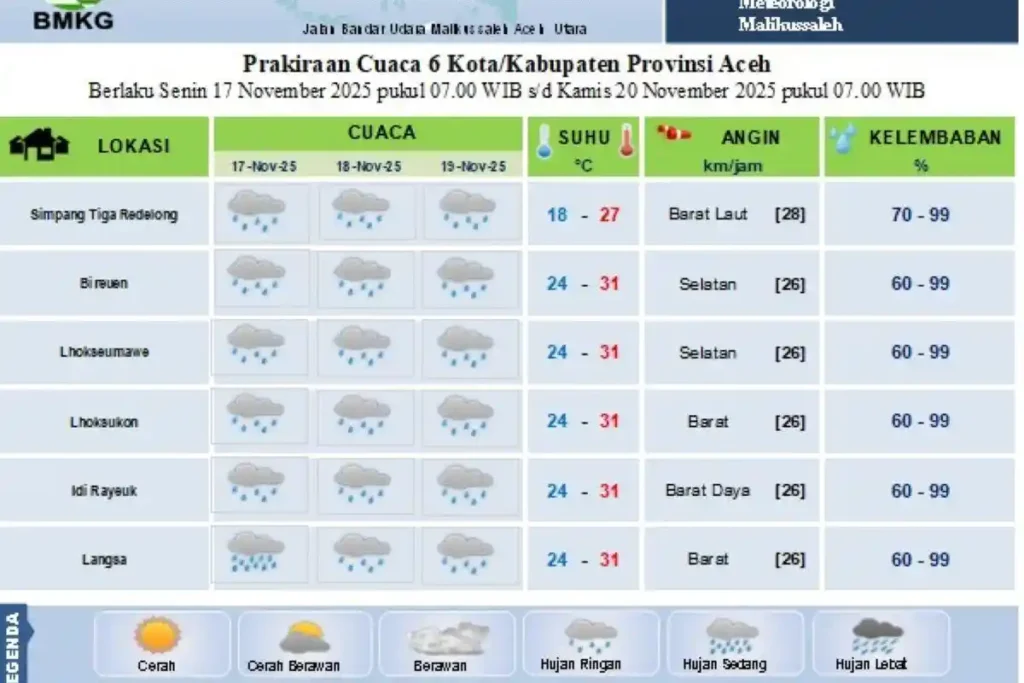 - Senin (17/11/2025): Bener Meriah, Bireuen, Lhokseumawe, Aceh Utara, dan Aceh Timur diprediksi diguyur hujan ringan. Langsa mengalami hujan dengan intensitas sedang.