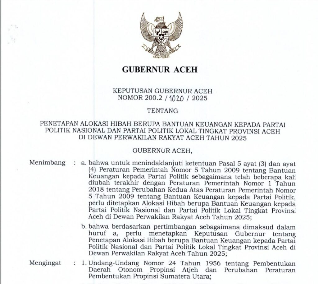 “Dana hibah ini bukan hanya bantuan rutin, tetapi instrumen untuk memperkuat peran partai dalam pendidikan politik masyarakat Aceh,” tulis SK tersebut sebagaimana dikutip, Selasa (11/11/2025).